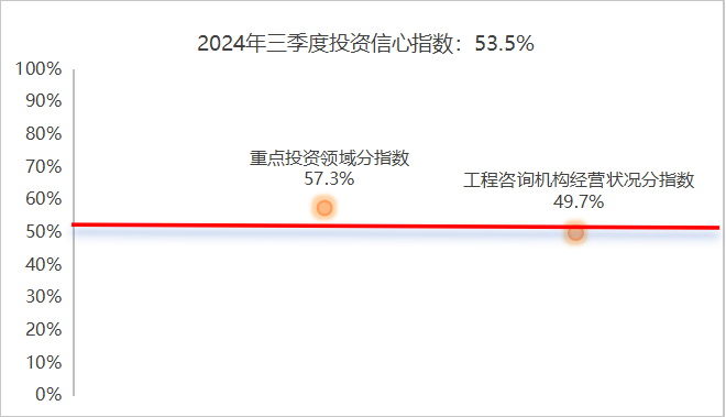 2024年三季度投資信心指數(shù)為53.5%,較二季度上升1%,投資信心向好。投資信心指數(shù)由重點(diǎn)投資領(lǐng)域分指數(shù)和工程咨詢機(jī)構(gòu)經(jīng)營狀況分指數(shù)構(gòu)成,其中重點(diǎn)投資領(lǐng)域分指數(shù)對投資信心指數(shù)支撐作用明顯。